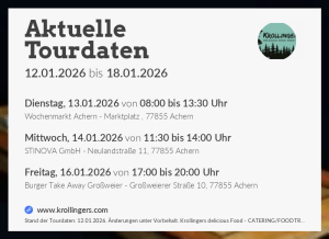 NEWS Veröffentlicht am 9. Oktober 202312. Januar 2026 von krollinger Am Freitag ist es wieder soweit wir starten mit unserem burgertakeaway ins neue Jahr Hier unsere neusten GOOGLE REZENSIONEN!! folgt uns auf Instagram, Facebook und Ihr seid immer auf dem neusten Stand!! Ihr plant eine Hochzeit, Firmenevent, Geburtstag oder einfach nur ein kleines Fest? Ihr seit nur ein -> KLICK<- entfernt ein kleiner auszug an firmen für die wir schon arbeiten durften –> KLICK<– Ihr findet uns auch auf http://www.foodtrucks-deutschland.de