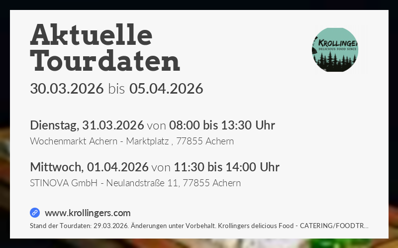 NEWS Veröffentlicht am 9. Oktober 202329. März 2026 von krollinger wir haben im spätjahr noch einige freie termine für euch Hier unsere neusten GOOGLE REZENSIONEN!! folgt uns auf Instagram, Facebook und Ihr seid immer auf dem neusten Stand!! Ihr plant eine Hochzeit, Firmenevent, Geburtstag oder einfach nur ein kleines Fest? Ihr seit nur ein -> KLICK<- entfernt ein kleiner auszug an firmen für die wir schon arbeiten durften –> KLICK<– Ihr findet uns auch auf http://www.foodtrucks-deutschland.de