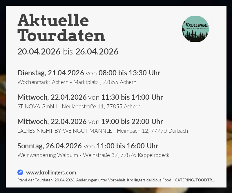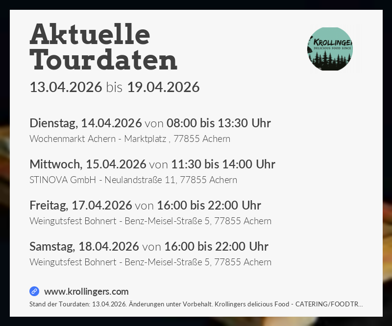 NEWS Veröffentlicht am 9. Oktober 202313. April 2026 von krollinger wir haben im spätjahr noch einige freie termine für euch Hier unsere neusten GOOGLE REZENSIONEN! folgt uns auf Instagram, Facebook und Ihr seid immer auf dem neusten Stand!! Ihr plant eine Hochzeit, Firmenevent, Geburtstag oder einfach nur ein kleines Fest? Ihr seit nur ein -> KLICK<- entfernt ein kleiner auszug an firmen für die wir schon arbeiten durften –> KLICK<– Ihr findet uns auch auf http://www.foodtrucks-deutschland.de
