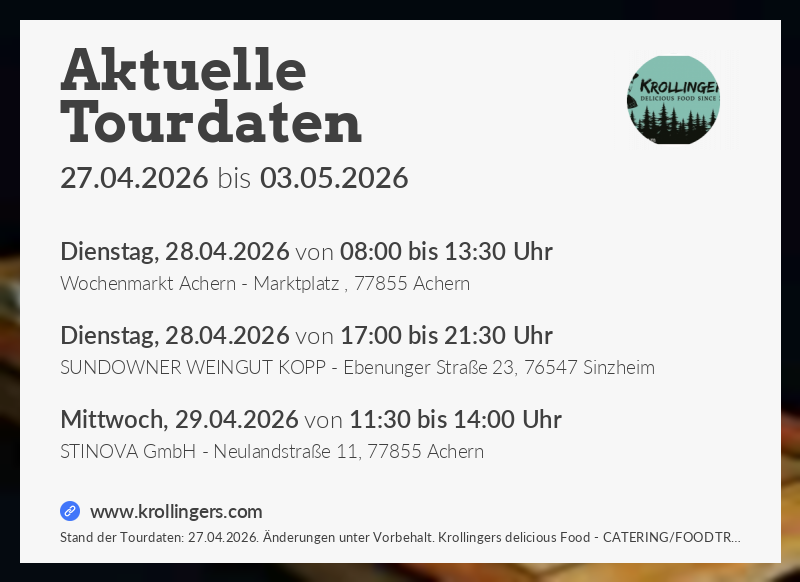 NEWS Veröffentlicht am 9. Oktober 202320. April 2026 von krollinger wir haben im spätjahr noch einige freie termine für euch Hier unsere neusten GOOGLE REZENSIONEN! folgt uns auf Instagram, Facebook und Ihr seid immer auf dem neusten Stand!! Ihr plant eine Hochzeit, Firmenevent, Geburtstag oder einfach nur ein kleines Fest? Ihr seit nur ein -> KLICK<- entfernt ein kleiner auszug an firmen für die wir schon arbeiten durften –> KLICK<– Ihr findet uns auch auf http://www.foodtrucks-deutschland.de